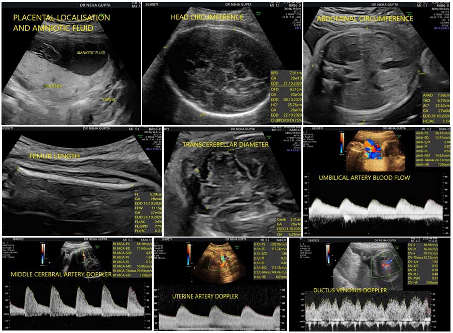 Fetal dopplers mean assessment of baby’s blood flows. Maternal blood flows to the uterus are assessed by uterine artery Dopplers. Blood flow through cord is called as umbilical artery blood flow. Blood through baby’s brain is called as middle cerebral artery Dopplers and through tummy is referred to as ductus venosus Dopplers.